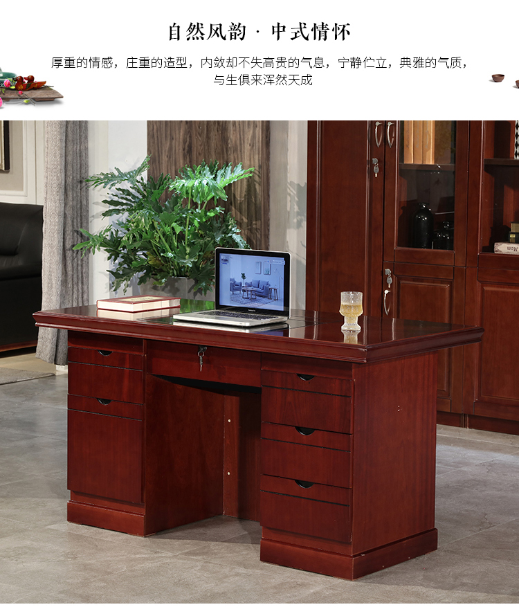 办公桌电脑桌油漆桌办公室经典职员桌写字台带键盘托红棕色1.2米含椅子