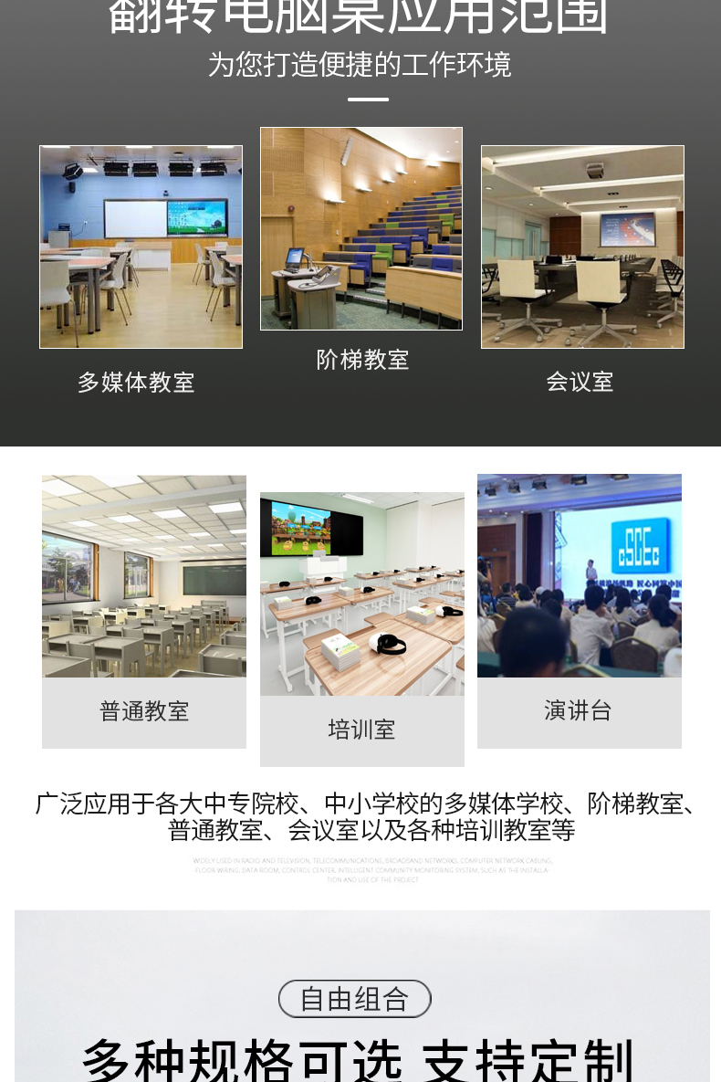 翻转桌培训桌多媒体课桌计算机考试翻转器课桌黄榉色三人翻转式课桌-箱体 2400*600*750mm